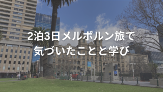 思考 2泊3日メルボルン旅で気づいたことと学び 先々週、オーストラリア・メルボルンに2泊3日の旅行に行ってきた。旅行から帰りすぐに引越しがあったり、仕事が忙しく、パソコンを開く時間が無いまま結構時間が経ってしまった。色々継続できていたルーティーンが崩れてしまった。時間は普段よりは少なかっ... 2026.03.29 思考